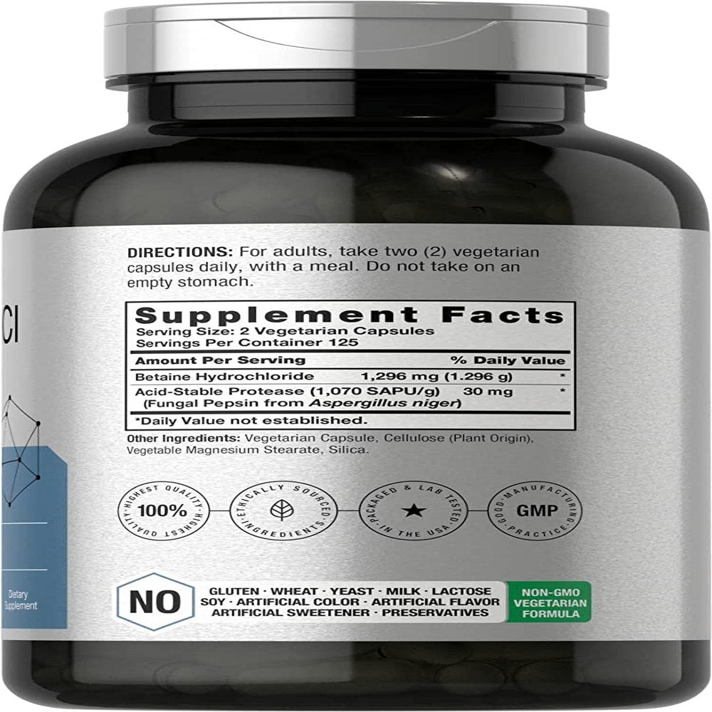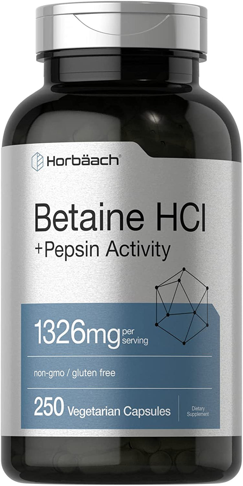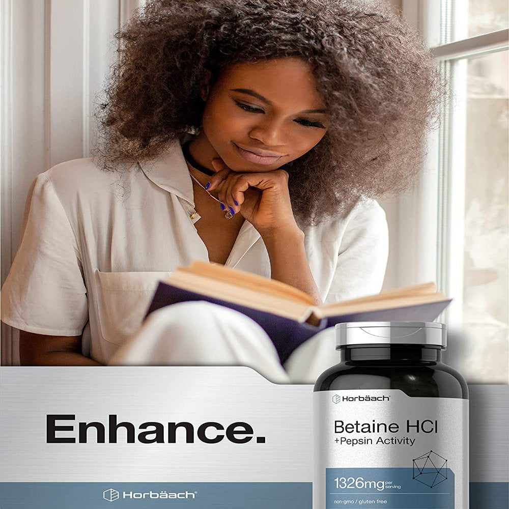 Horbaach Betaine HCl is a scientifically crafted supplement that combines 1,326 mg per serving of Betaine HCl with Acid-Stable Protease derived from Fungal Pepsin in vegetarian capsules. Our formula is gluten-free and non-GMO, with no artificial sweetener or preservatives. It’s lab tested for purity and potency, guaranteeing exceptional quality for your wellness routine!