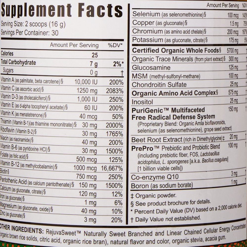 - Contains whole foods, plant derived minerals, antioxidants, prebiotics, probiotics, and amino acids