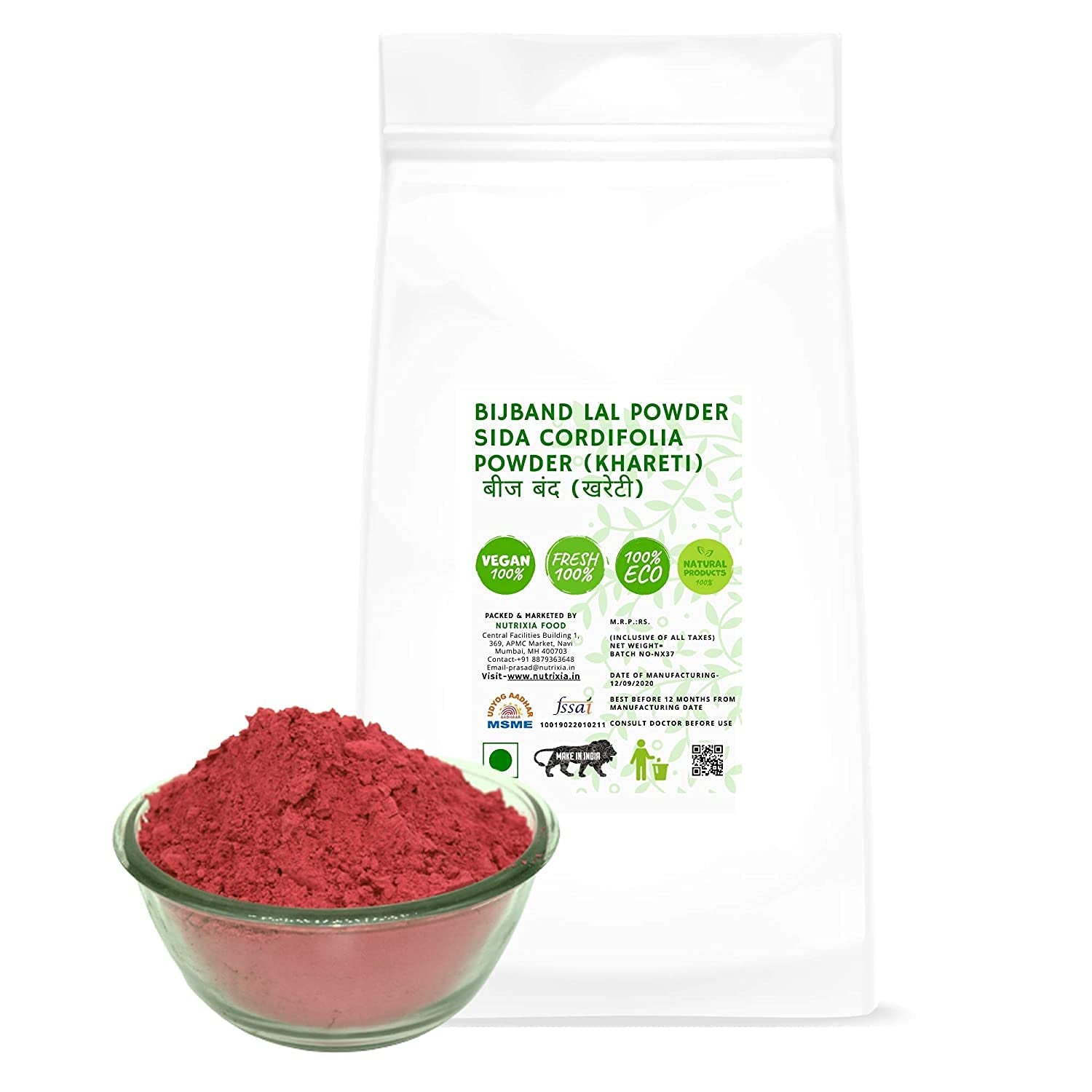 - Other Names-Bijband Lal Powder Sida Cordifolia Beej Band Red Powder KHARETI बीज बंद (खरेटी Packaging- We believe in transparency and our packaging reflects It. Our products are packed in good quality transparent standing plastic pouch with zip lock which can be reusable. Storage Instructions: Please reseal the packet after every use. Keep away from moisture and direct sunlight. Use the contents within 3 months of opening.and 12 months from date of packing. About US Nutrixia Food is retailer and wholesaler of good quality Spices, Herbs, Ayurvedic products, Cereals, Oilseeds, Dry fruits, Essential oils and Grocery items.
