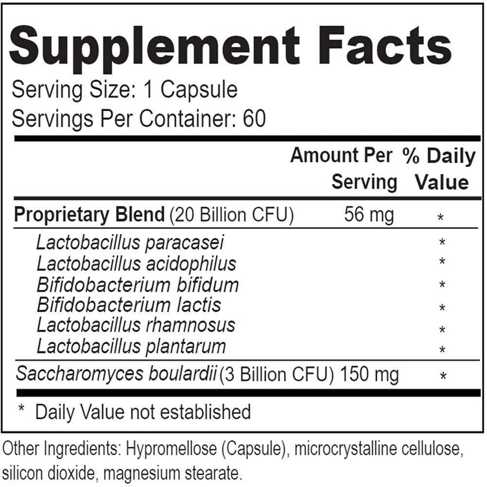 Lactobacillus Acidophilus, Lactobacillus Paracasei, Bifidobaterium Lactis, Bifidobacterium Bifidum, Lactobacillus Plantarum, Lactobacillus Rhamnosus, Saccharomyces Boulardii, Hypromellose (capsule), Microcrystalline Cellulose, Silicon Dioxide, Magnesium Stearate/div>