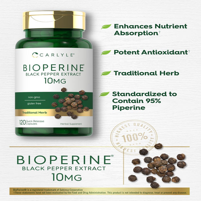 Bioperine 10Mg 120 Capsules | Sourced from Black Pepper Extract | by Carlyle