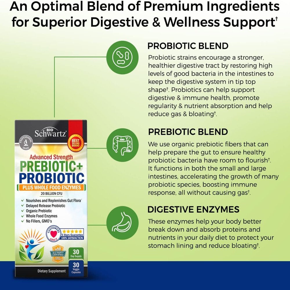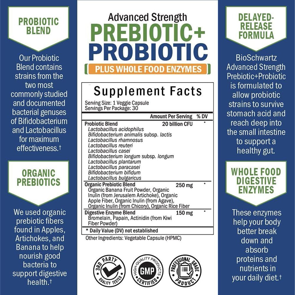 3-WAY DIGESTIVE SUPPORT. Triple down on digestive health with BioSchwartz Prebiotic + Probiotic! Each serving is powered by organic Prebiotics, natural Probiotics and Whole Food Enzymes to support digestive health, naturally. PROMOTES IMMUNE HEALTH. Studies show 70% of our immune system lives in our gut. Our delayed release capsule allows 20 billion CFU’s to survive stomach acid, bile and oxidation. This ensures our Prebiotics, Probiotics and Whole Food Enzymes reaches where your body will benefit the most. ENCOURAGES WHOLE BODY HEALTH. A healthier gut can lead to a healthier you! Get a daily dose of everything you need to support your digestive system in one capsule with the Advanced Strength Prebiotic + Probiotic formula.