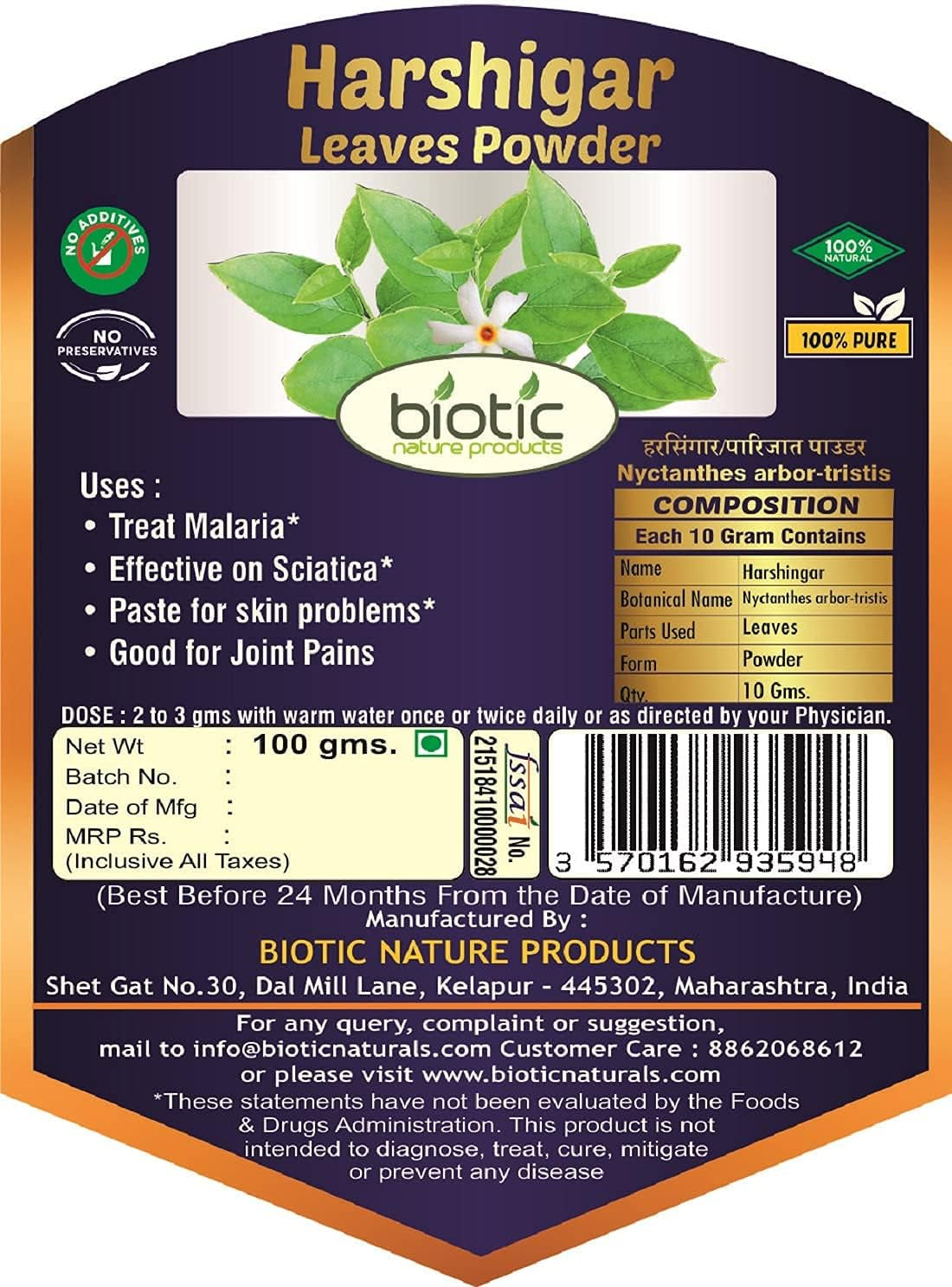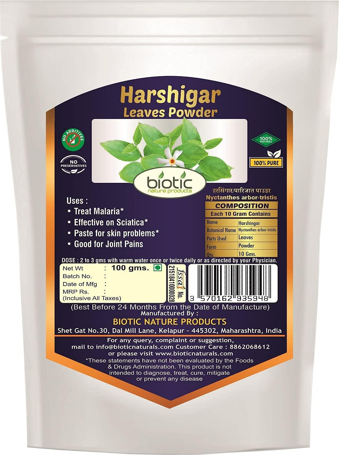 Biotic Harshingar Leaves Powder (Nyctanthes Arbor-Tristis) Parijat Leaves Powder -100Gms