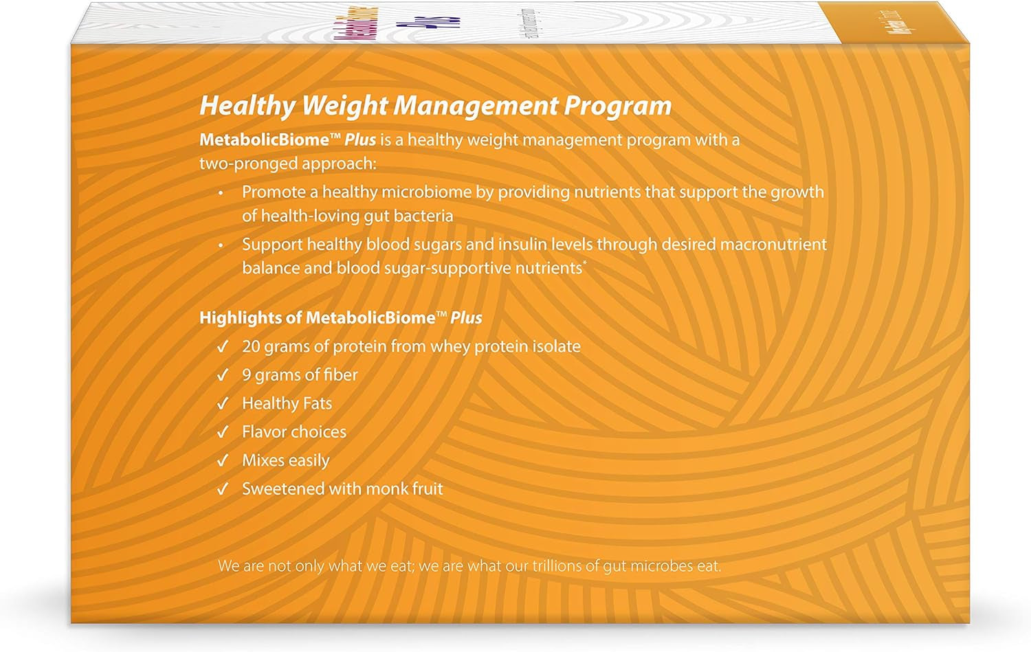 - SUPPORTS HEALTHY MICROBIOME: A healthy gut is central to overall health. Our guts produce metabolites that foster metabolic health, influencing optimal weight. Carefully selected ingredients in MetabolicBiome Plus upregulate the activity of healthy gut microbes.
