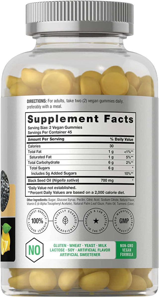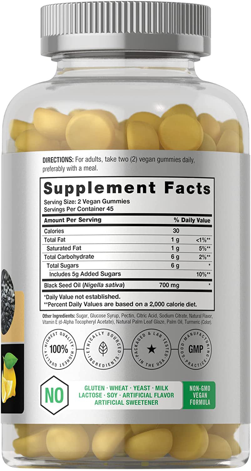 - VEGAN GUMMIES: Delivers 700 mg of Black Seed Oil per serving in natural lemon flavored gummies