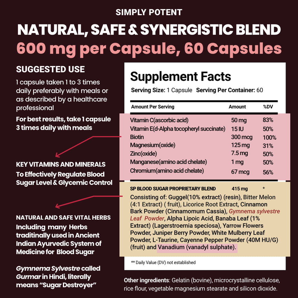 PROVEN EXCLUSIVE HIGH POTENCY BLEND* – Simply Potent Blood Sugar Proprietary Blend consists of unique combination of ALA, Gymnema, Bitter Melon, Cinnamon, Guggul, Juniper Berry, Banaba Leaf, White Mulberry, Yarrow, Cayenne, L-Taurine, and Vanadium to manage Blood Glucose level effectively. Many of these herbs have been in use in India as Ayurvedic medicine for centuries. Gymnema, an important herb for sugar control.