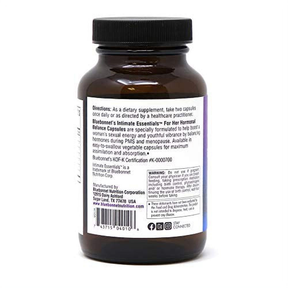 Bluebonnets Intimate Essentials For Her Hormonal Balance Capsules are specially formulated to help boost a womans sexual energy and youthful vibrance by balancing hormones during PMS and menopause. Available in easy-to-swallow vegetable capsules for maximum assimilation and absorption.