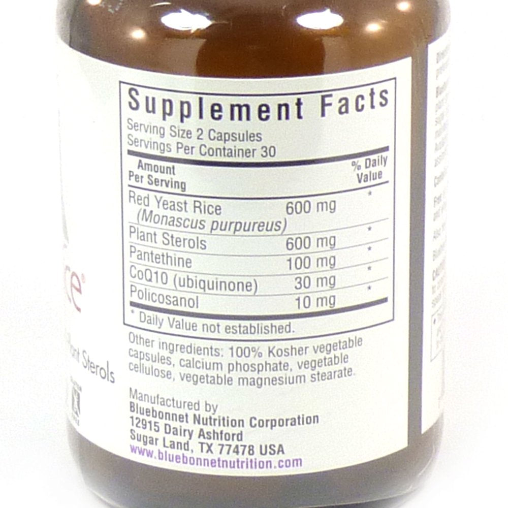 Bluebonnet Nutrition CholesteRice Red Yeast Rice Complex- 60 Vegetarian CapsulesBluebonnet's CholesteRice Capsules provide red yeast rice, plant sterols, pantethine, natural trans-isomer coenzyme Q-10 and sugar cane wax derived policosanol. Bluebonnet's CholesteRice Capsules is a unique formula that helps to maintain cholesterol levels that are already within the normal range. Bluebonnet's CholesteRice Capsules are available in easy-to-swallow vegetable capsules for maximum assimilation and