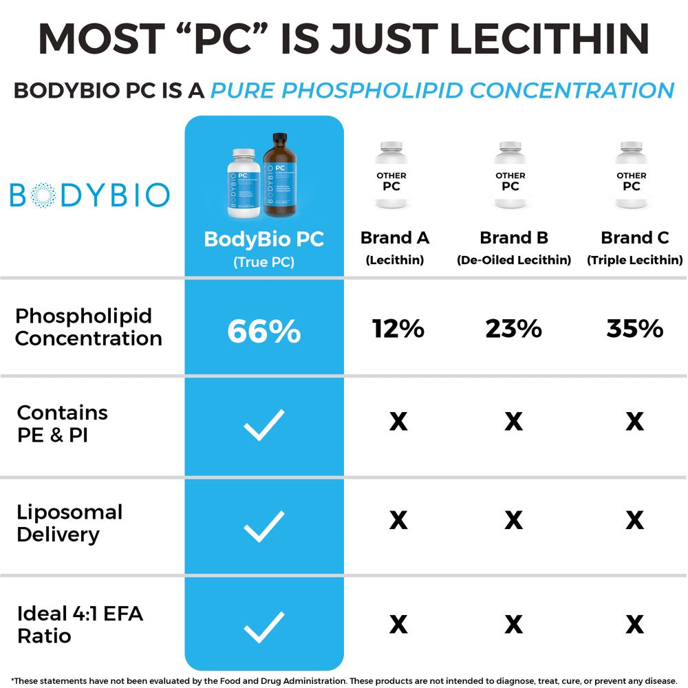 - TRUE PC FORMULA: The terms lecithin and PC are often used interchangeably, and most “phosphatidylcholines” on the market are lecithin packed in oil. However, they are not the same. BodyBio pioneered the "Pure Phospholipid" PC extraction from Soy Lecithin. Unlike lecithin alone, these pure phospholipids automatically form liposomes in the watery environment of the body.
