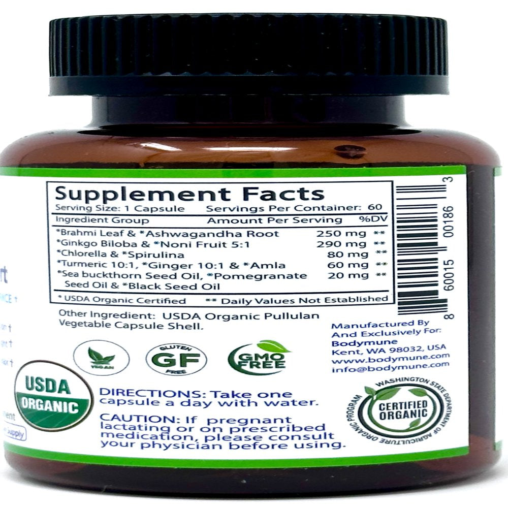- QUALITY INGREDIENTS: Made with USDA Organic Ginkgo Biloba, Ashwagandha Root, Brahmi Leaf, Chlorella, Spirulina, Noni Fruit 5:1, Turmeric 101, Amla Fruit, Ginger 10:1, Sea buckthorn Seed Oil, Pomegranate Seed Oil, and Nigella Sativa (Black Seed) Seed Oil - 100% Vegan, Non-GMO, Gluten-free, Dairy-free.