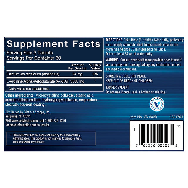 Bodytech Arginine AKG (Arginine Alpha Ketoglutarate) 3000 MG - Nitric Oxide Precursor, 60 Servings (180 Tablets) is backordered and will ship as soon as it is back in stock.
