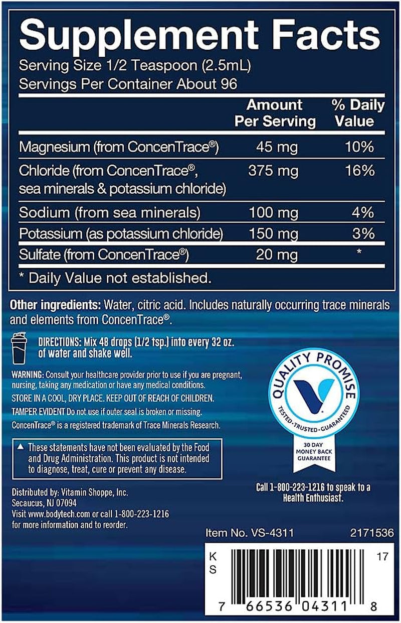 Supports hydrationMay help reduce cramping associated with electrolyte imbalancesUnflavored Replenish whatever you sweat out at the gym with BodyTech Liquid Electrolytes. This unflavored sports supp features ConcenTrace: a blend of natural pH-balancing minerals that are low in sodium, ionic, and soluble to keep you hydrated throughout your workout. Frequently Asked Questions What exactly are electrolytes?Electrolytes are minerals such as calcium, chloride, magnesium, phosphorus, potassium, and sodium, that carry an electric charge. They affect the amount of water in your body, blood pH levels, and muscle and nerve function.