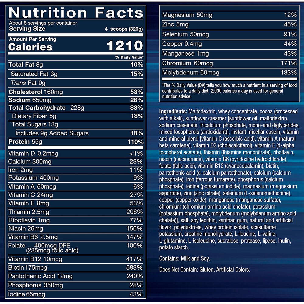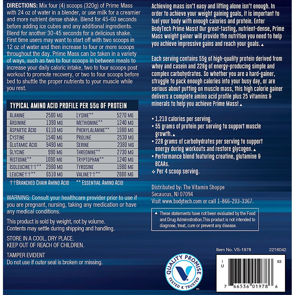 - Prime Mass comes in great flavors and is nutrient dense, with 55 grams of high-quality protein derived from whey and casein, as well as 225 grams of energy-producing carbohydrates