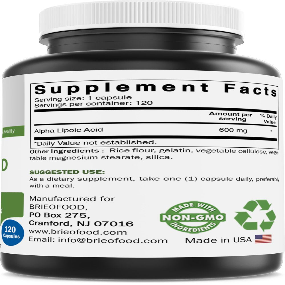 Brieofood Alpha Lipoic Acid 600 mg 120 Capsules. Free of gluten, wheat, milk/dairy, nuts, soy, eggs, fish, shellfish, yeast, sugar, lactose, & artificial additive. All Brieofood products are manufactured in the USA in accordance with Good Manufacturing Practices (GMP), among the highest quality standards in the world.