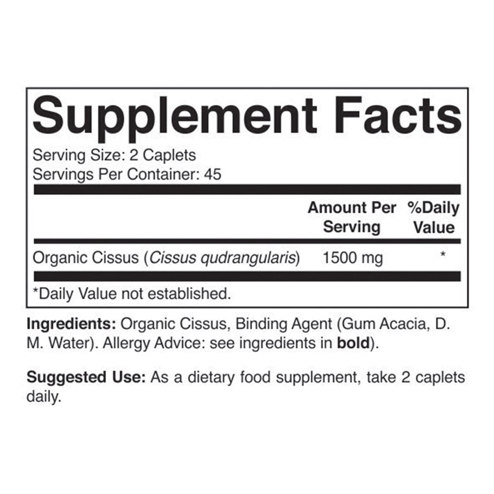 - 1,500mg of Organic Cissus Per Serving, 750mg Per Tablet