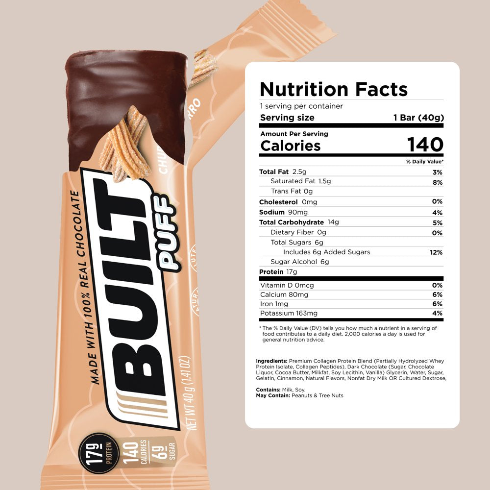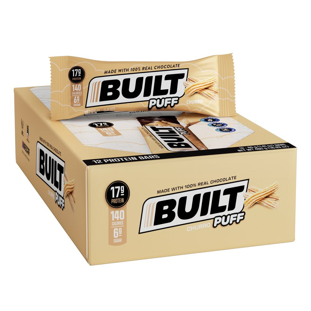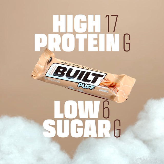 - FUEL YOUR BODY WITH DELICIOUS PROTEIN - BUILT Bar Variety 12 Pack, packed with 17g Protein. BUILT Puffs are the perfect way to get your daily dose of protein. Enjoy the delicious flavor of Churro