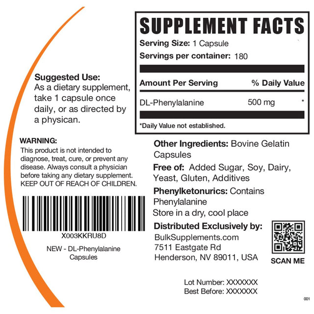 Bulksupplements.Com Dl-Phenylalanine Capsules, 500Mg - Brain, Liver, & Skin Support Supplements (180 Gel Caps - 180 Servings) is backordered and will ship as soon as it is back in stock.