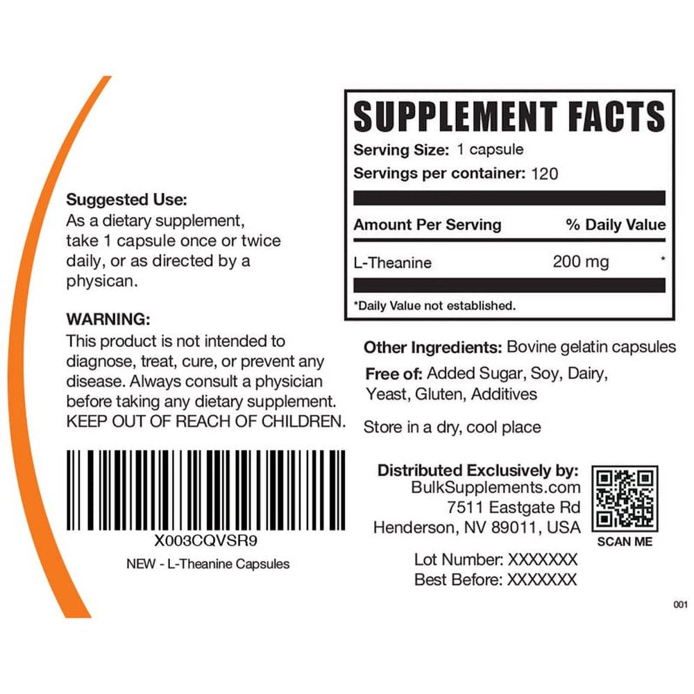 - BulkSupplements.com L-Theanine Capsules, 200mg