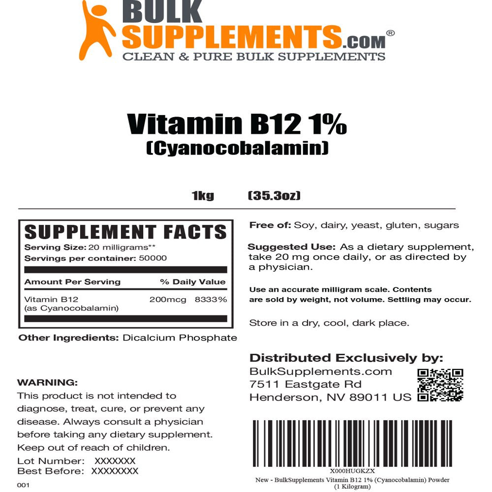 Bulksupplements.Com Vitamin B12 1% (Cyanocobalamin) Powder - B12 Vitamins - Cyanocobalamin B12 - Energy Vitamins - B12 Powder (1 Kilogram)