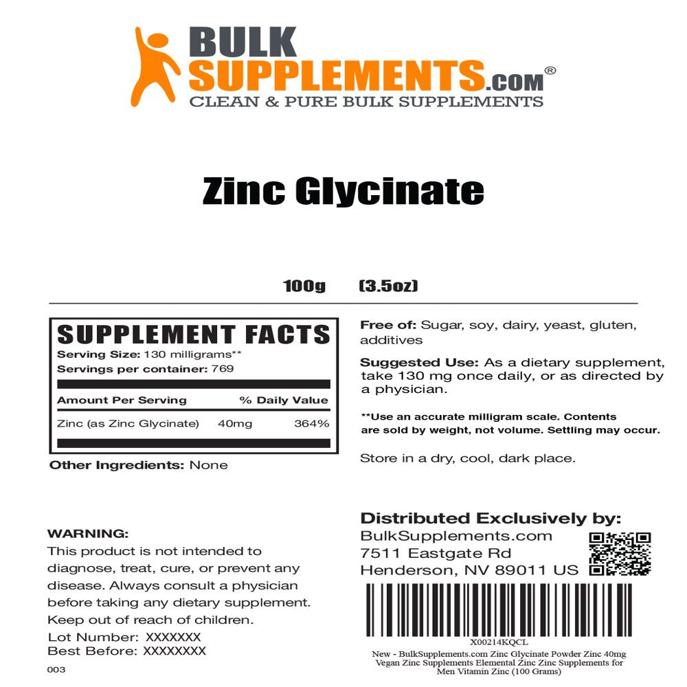 Bulksupplements.Com Zinc Glycinate Powder - Zinc 40Mg - Vegan Zinc Supplements - Elemental Zinc - Zinc Supplements for Men - Vitamin Zinc (100 Grams)