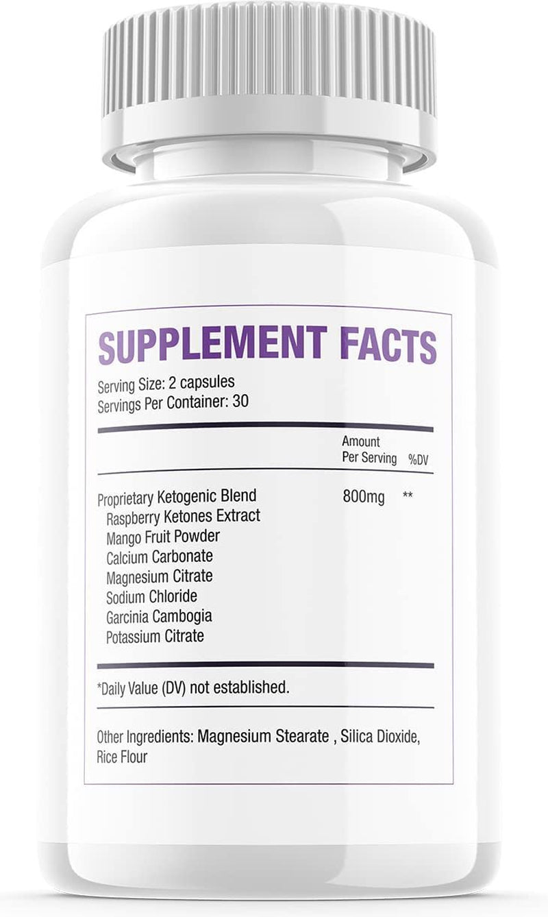 Ingredients:800mg Proprietary Ketogenic Blend: Raspberry Ketones, Gardenia Cambodia, Apple Cider Vinegar, Green Tea Leaf Extract
