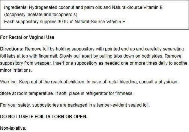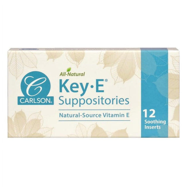 Carlson Key E Suppositories are natural soothing inserts. Each suppository delivers 30 IU of natural-source vitamin E. The inserts are prepared with a base derived from coconut and palm oils. This non-laxative formula soothes and features antioxidants. For rectal or vaginal use.