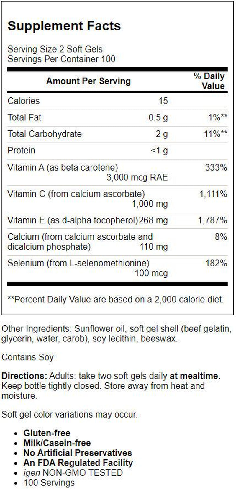Igen Non-GMO Tested Vitamins A, C, E + Selenium Dietary Supplement Cellular Health Immune Support Antioxidant Gluten-Free Milk/Casein-Free No Artificial Preservatives Potency & Quality Guaranteed An FDA Regulated Facility Carlson - Providing the highest quality nutritional supplements since 1965 Environmental pollution, dietary fats, and heavy exercise can product unstable, cell-damaging substances called free radicals. ACES® is a highly active antioxidant complex that provides vitamin A, C, E, and selenium to help protect our body from the harmful effects of free radicals. Selenium also serves as a vital building block for glutathione peroxidase, one of the most powerful antioxidant enzymes in our body.