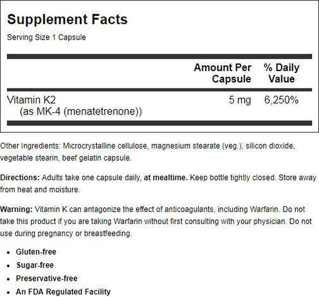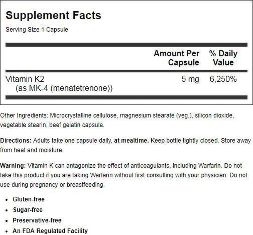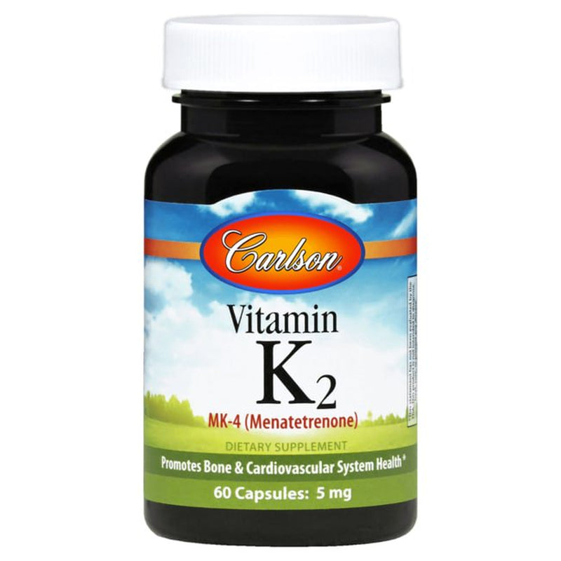 Carlson Vitamin K2 MK-4 Menatetrenone provides 5mg of vitamin K2 as MK-4 menatetrenone in each capsule. Research suggests that vitamin K2 promotes a healthy cardiovascular system as well as promotes healthy bones and cartilage.