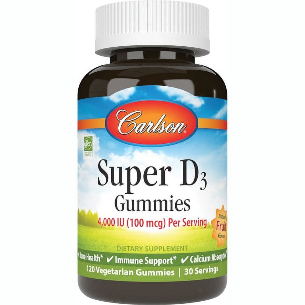Carlson Labs - Super Vitamin D3 Gummies Natural Fruit 4000 IU - 120 Gummies Super D3 Gummies provide 4,000 IU (100 mcg) of vitamin D3 per serving, which promotes teeth, bone, and muscle health; healthy immune and cardiovascular system function; and calcium absorption. Each bottle has an assortment of strawberry, lemon, and orange flavored gummies. Super D3 gummies are a stress-free way for your whole family to get their vitamin D every day.