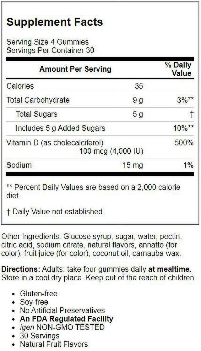 - Provides 4,000 IU (100 mcg) of vitamin D3 per serving