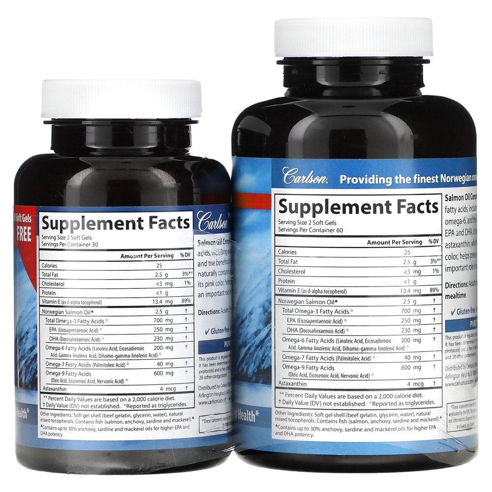 Carlson Norwegian Salmon Oil Complete delivers omega-3s EPA and DHA along with astaxanthin. Salmon Oil Complete has a full range of omegas (featuring 15 fatty acids) including the important omega-3s EPA and DHA, plus astaxanthin, an antioxidant naturally found in salmon which gives it its pink color. Up to 30% anchovy, sardine and mackerel oils are added for higher EPA and DHA potency.
