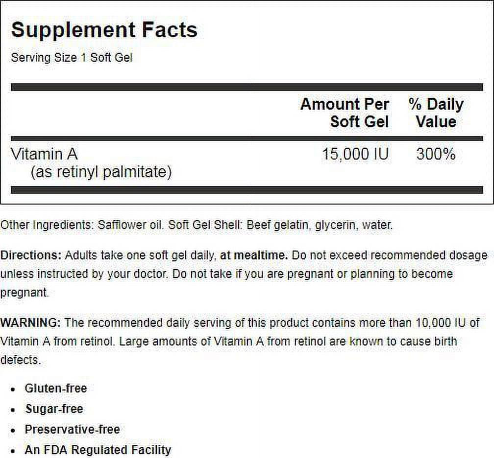 - 15,000 IU (4,500 mcg RAE) of vitamin A palmitate per soft gel