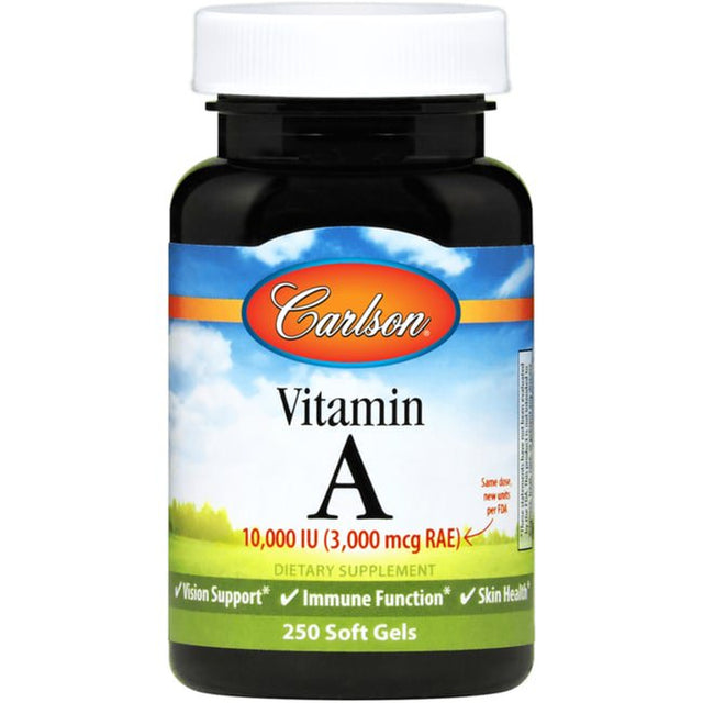 Carlson Labs Vitamin A 10,000 IU - 250 Soft Gels Carlson Labs Vitamin A 10,000 IU is an essential nutrient in human nutrition. Vitamin A is categorized as a fat-soluble vitamin as it is stored in the fatty portions of the body's organs and tissues. Vitamin A is available in two forms: pre-formed Vitamin A (from fish liver) and Pro Vitamin A (Beta carotene from fruits and vegetables).