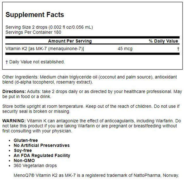 Carlson Liquid Vitamin K, Super Daily K2, 45 Mcg, 0.34 Fl Oz (10.16 Ml) - Unflavored / 360 Drops is backordered and will ship as soon as it is back in stock.