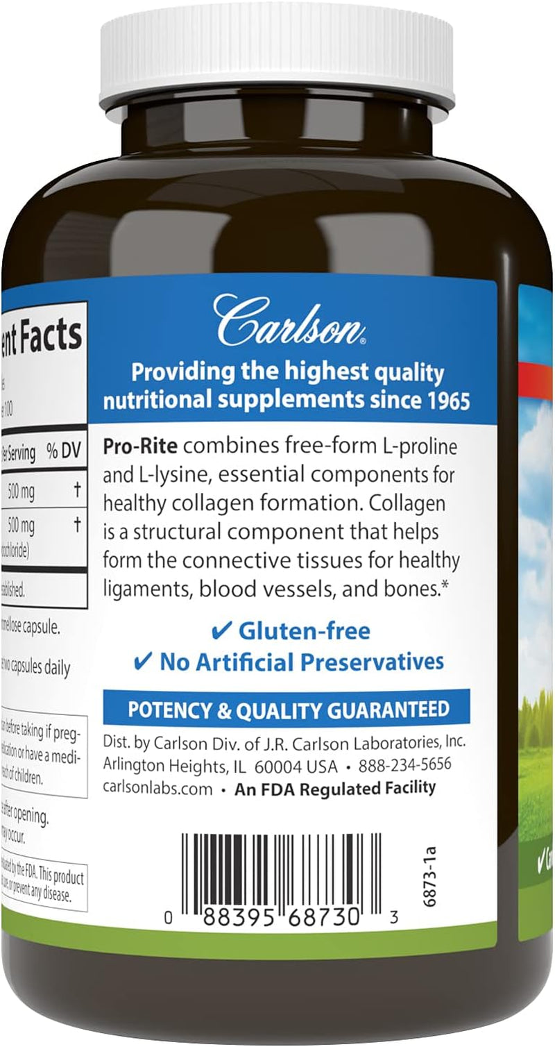 Carlson - Pro-Rite, Free-Form L-Proline & L-Lysine, Health, Joint Support & Collagen Formation, 200 Capsules