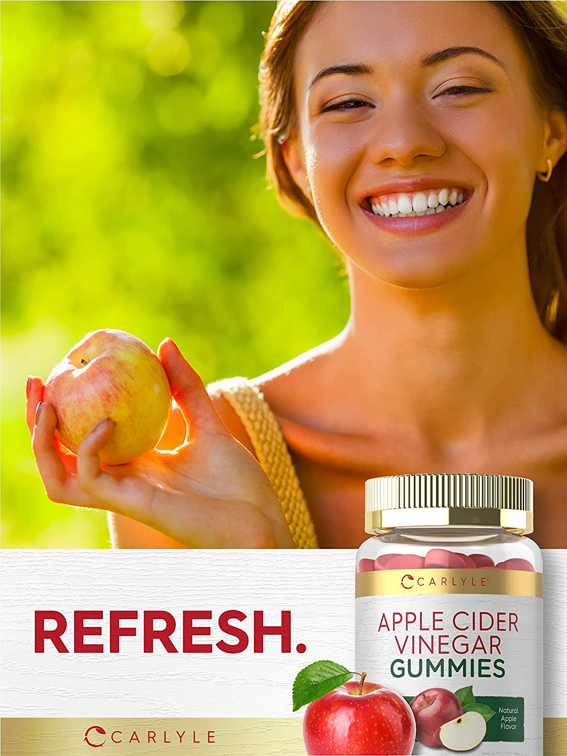 Origin of Apple Cider Vinegar:Apple Cider Vinegar is a widely renowned ingredient that has been touted in wellness traditions for centuries for various health benefits. It is made through a special fermentation process that produces the compound, Acetic Acid. Historically, uses of liquid Apple Cider Vinegar included dressings for cooking, topical skin & hair products like shampoo. | Apple Cider Vinegar Supplements:Today, Apple Cider Vinegar has become an amazing ingredient in supplements. The most common forms include capsules, powder, tablets, pills and more. Now you also have the option to supplement with our natural apple-flavored gummies! | Carlyle’s Apple Cider Vinegar Gummies:Our vegan formula is Non-GMO and contains no artificial flavor or sweetener. Simply add Apple Cider Vinegar to your daily routine today with Carlyle's gummies. |