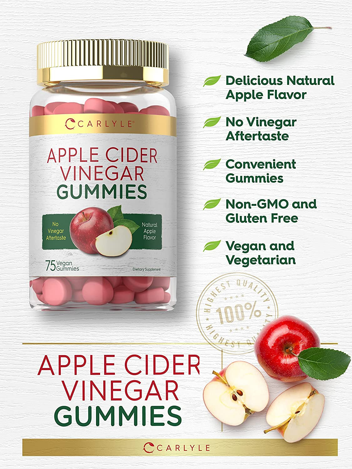 Carlyle Vegan Apple Cider Vinegar Gummies | 75 Count | Natural Apple Flavor | Non-Gmo, Gluten Free | ACV Supplement