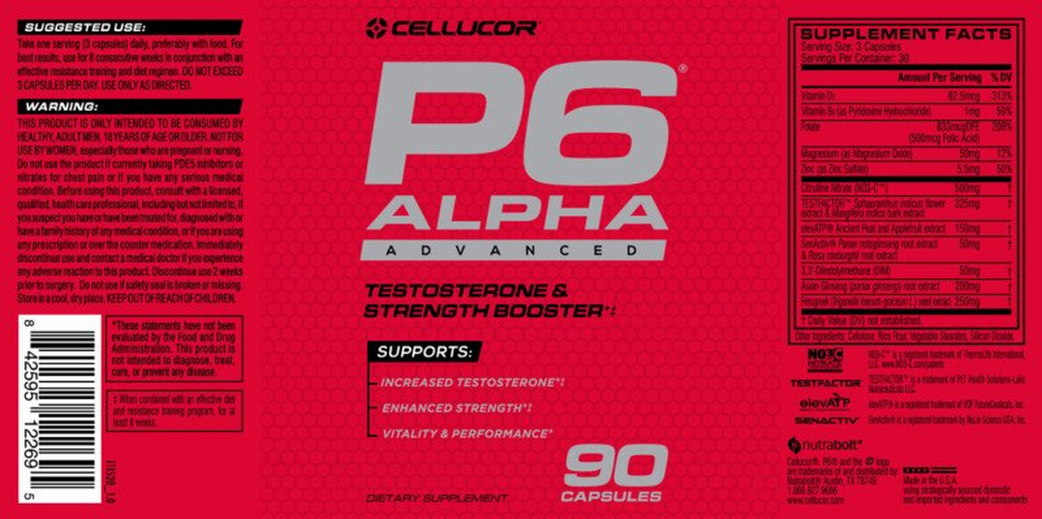 P6 Alpha Advanced - – Citrulline Nitrate (NO3-C ™), TEST FACTOR™ Sphaeranthus indicus flower extract & Magnifier indica bark extract, elevATP® Ancient Peat and Apple fruit extract, SenActiv® Panax notoginseng root extract & Rosa roxburghii root extract, 3,3’-Diindolylmethane (DIM), Asian Ginseng (panax ginseng) root extract, Fenugreek (Trigonella foenum-graceum L.) seed extract, Cellulose, Rice Flour, Vegetable Stearate, Silicon Dioxide. Legal Disclaimers: *Statements regarding dietary supplements have not been evaluated by the FDA and are not intended to diagnose, treat, cure, or prevent any disease or health condition.