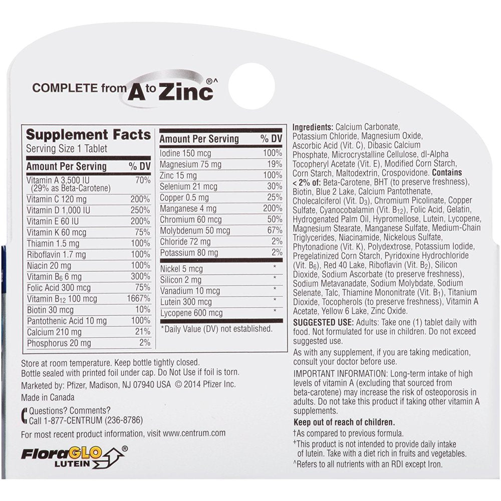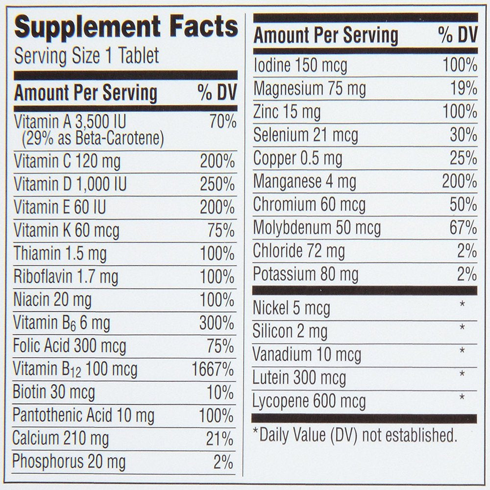 Environmental Stress: With vitamins C and E to help protect the body's cells from free radical damage caused by environmental stress. Metabolism: Contains B-vitamins to aid in the metabolism of fats, carbohydrates, and proteins. Vitality: With the complete range of B-vitamins for energy support. With the complete benefits of Centrum Silver Plus nutrients to support: heart health; immune function. 100 count bottle of Centrum Silver Multivitamin for Men 50 Plus, Multivitamin/Multimineral Supplement with Vitamin D3, B Vitamins and Zinc Multivitamins for men over 50 that are an ideal heart, eye and brain health supplement Senior multivitamins for men that contain micronutrients to feed cells and help support full body wellness Multivitamins for men 50 and over that help support immune health, bone health and muscle function with vitamin D Vitamins for eye health that are non GMO and gluten free Vitamins for men 50 plus that come in an easy-to-swallow tablet Take one of these vitamins for men over 50 every day to provide nutrients to support a healthy body