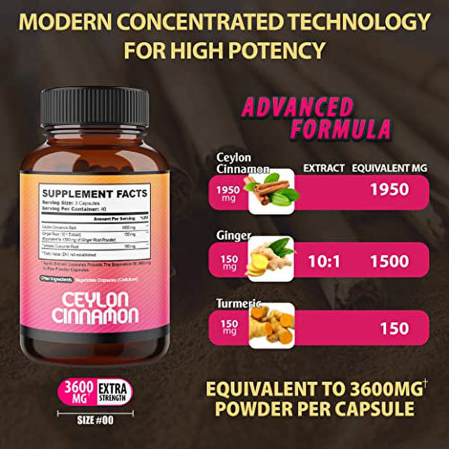 Ceylon Cinnamon Capsules - Combined with Ginger Root and Turmeric Curcumin - Equivalent to 3600 Mg Powder - Natural Mind and Body Balance Support Supplement - 120 Vegan Capsules