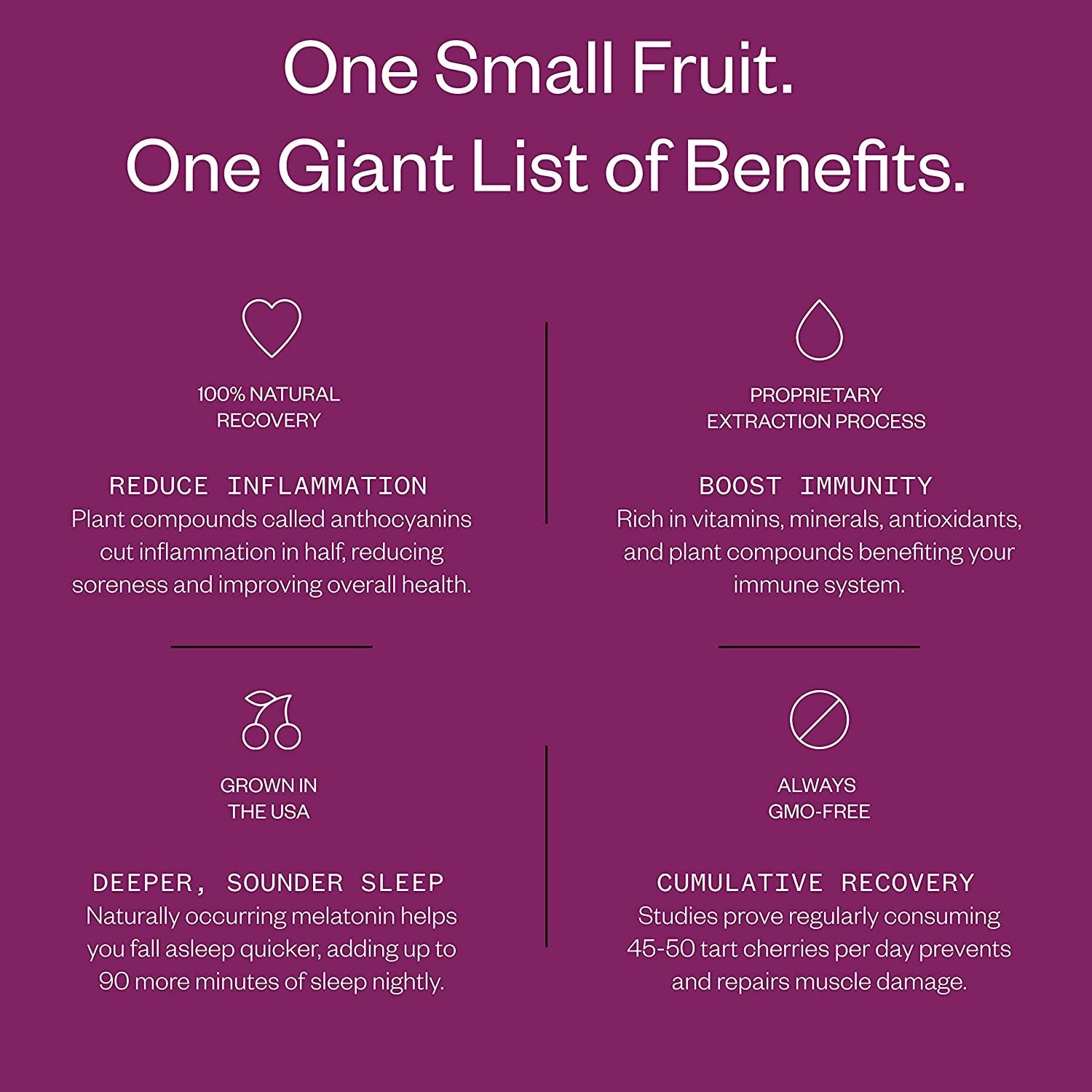 Tart cherries are one of the few natural sources of melatonin. We’ve added two more natural sleep aids, Valerian Root and L-Theatine (a green tea extract), to accentuate this benefit and promote a better night’s sleep.