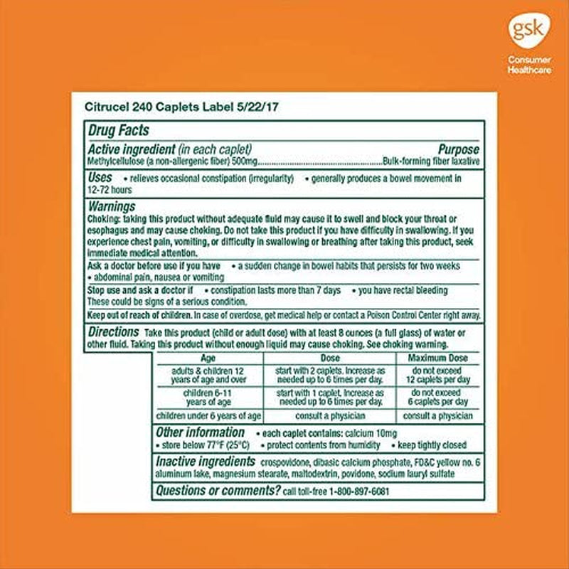 Citrucel is a fiber for regularity that won't cause excess gas. It helps restore and maintain regularity and relieves constipation (irregularity). for constipation associated with other bowel disorders like IBS, when recommended by a doctor, Citrucel with smartfiber generally produces a bowel movement within 12–72 hours. Better value per dose than leading competitor non-allergenic gluten free Citrucel contains Methylcellulose fiber, which is a non-toxic, non-allergenic and non-irritant fiber includes 240 fiber caplets