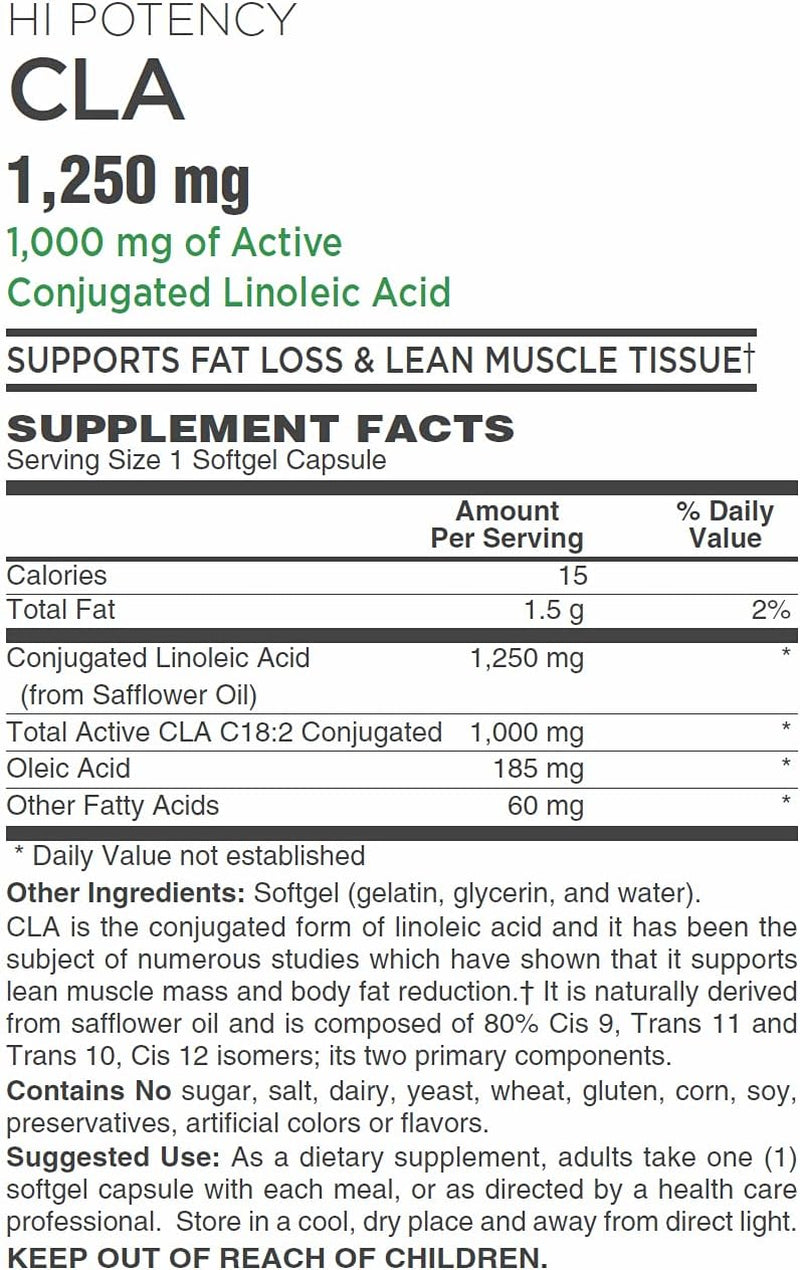 - 1,250 mg CLA per soft gel, 1,000mg Total Active CLA C1B:2 Conjugated
