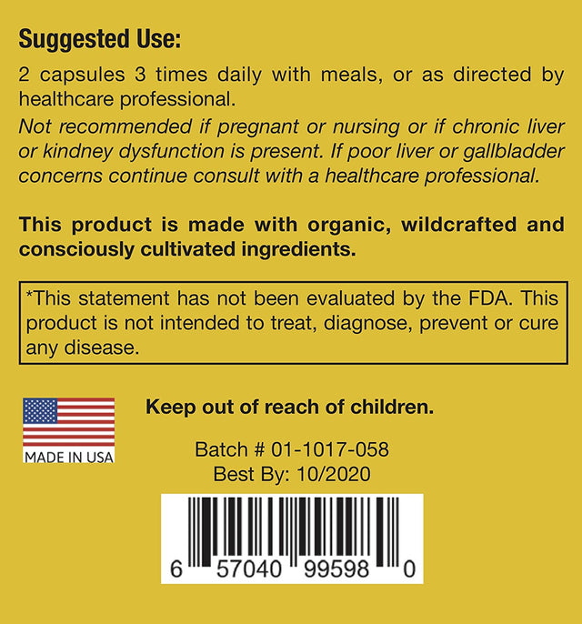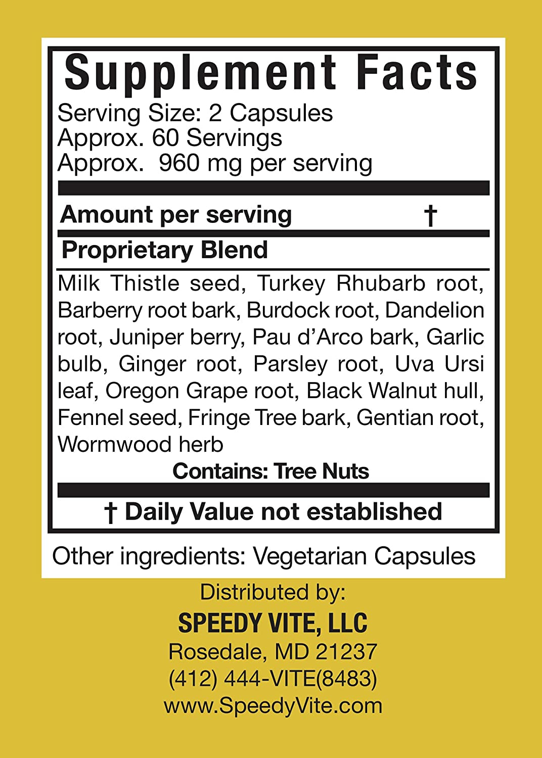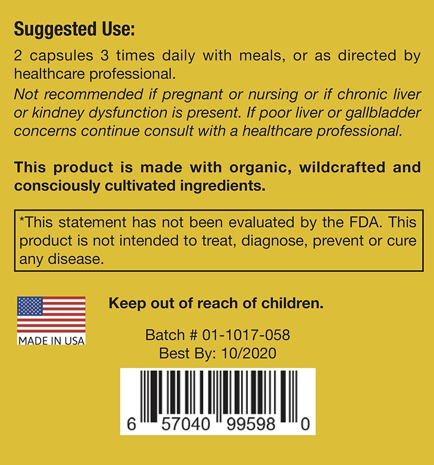 - ORGANIC & GOOD FOR YOU ✓ Made with organic, wildcrafted and consciously cultivated ingredients: Milk Thistle seed, Turkey Rhubarb root, Barberry root bark, Burdock root, Dandelion root, Juniper berry, Pau d’Arco bark, Garlic bulb, Ginger root, Parsley root, Uva Ursi leaf, Oregon Grape root, Black Walnut hull, Fennel seed, Fringe Tree bark, Gentian root, Wormwood herb ✓ 120 Veg Caps (Approx. 60 x 960 mg Servings) ✓ BPA Free