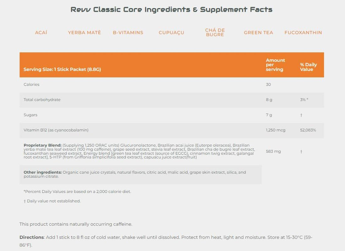 Introducing Revv Classic: Your Safe and Natural Energy Solution! Tired of drinks filled with refined sugars, excessive caffeine, and synthetic compounds that can harm your body? Look no further! Revv Classic was specially crafted to address the overwhelming abundance of energy supplements and drink products in the market today. We understand the need for an energizing option that is both safe and delicious, and we're proud to bring it to you! Say goodbye to the short-lived bursts of energy followed by crashing lows, and welcome a sustainable and revitalizing experience. With Revv Classic, you can now enjoy non-jittery energy that keeps you going throughout the day. Our formula also offers broad-spectrum antioxidant support, helping your body stay healthy and combat oxidative stress. But that's not all! Revv Classic is designed to aid in weight management and appetite suppression, making it an ideal choice for those seeking a healthy lifestyle. Experience enhanced circulation and enjoy sharpened mental clarity, allowing you to focus and perform at your best. Using Revv Classic is easy! Simply add one stick to 8 fl oz of cold water, shake well until dissolved, and you're ready to go. For optimal freshness, remember to protect the product from heat, light, and moisture by storing it between 15-30°C (59-86°F). Choose Revv Classic and embrace the energy you deserve – without compromising your well-being. Experience the boost you've been searching for, naturally! (Note: Please consult a healthcare professional before using this product, especially if you have any existing medical conditions or are taking medication.)