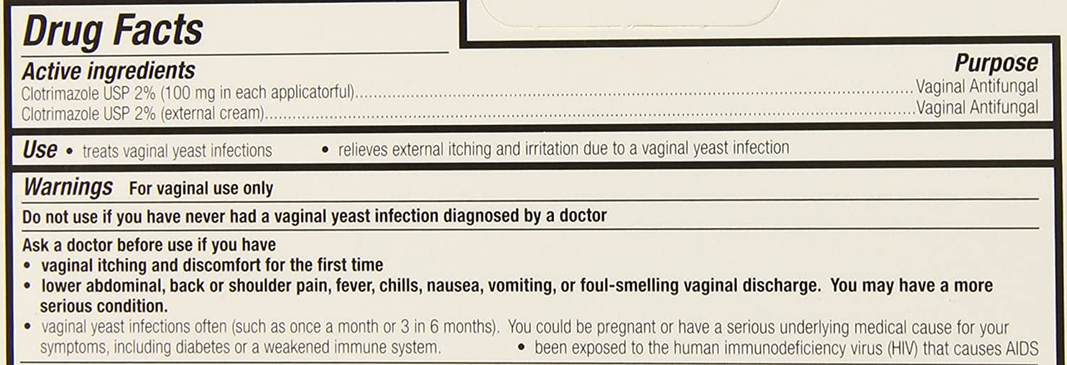 - Contains clotrimazole, an antifungal medication used for the treatment of vaginal yeast infection and the relief of external vulvar itching