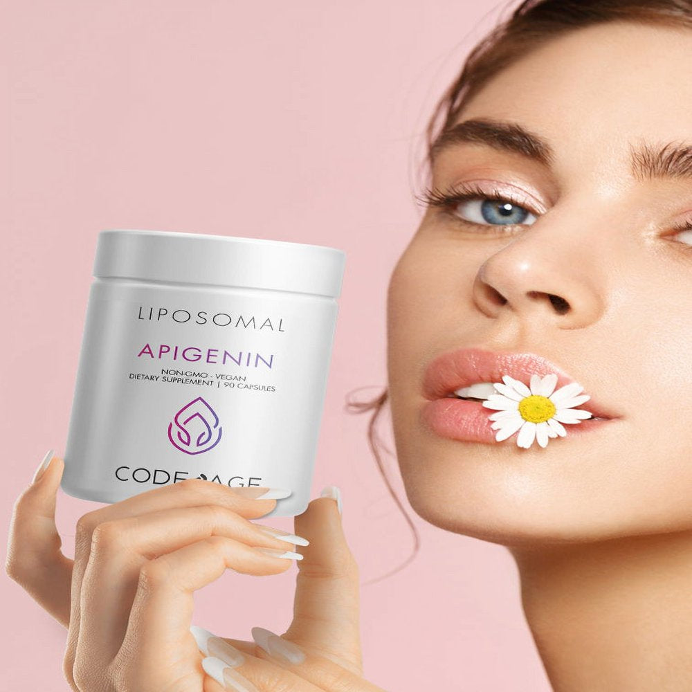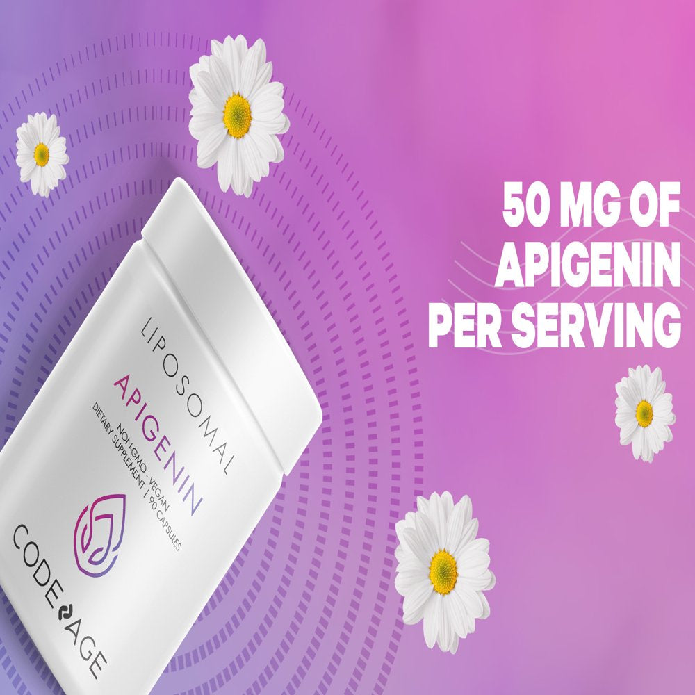 Codeage Liposomal Apigenin supplement offers 50 mg per serving of apigenin from chamomile extract, in a liposomal proprietary blend. This herbal-inspired chamomile tea formula provides flavonoids, phosphatidylcholine, and phospholipids sourced from non-GMO sunflower oil.