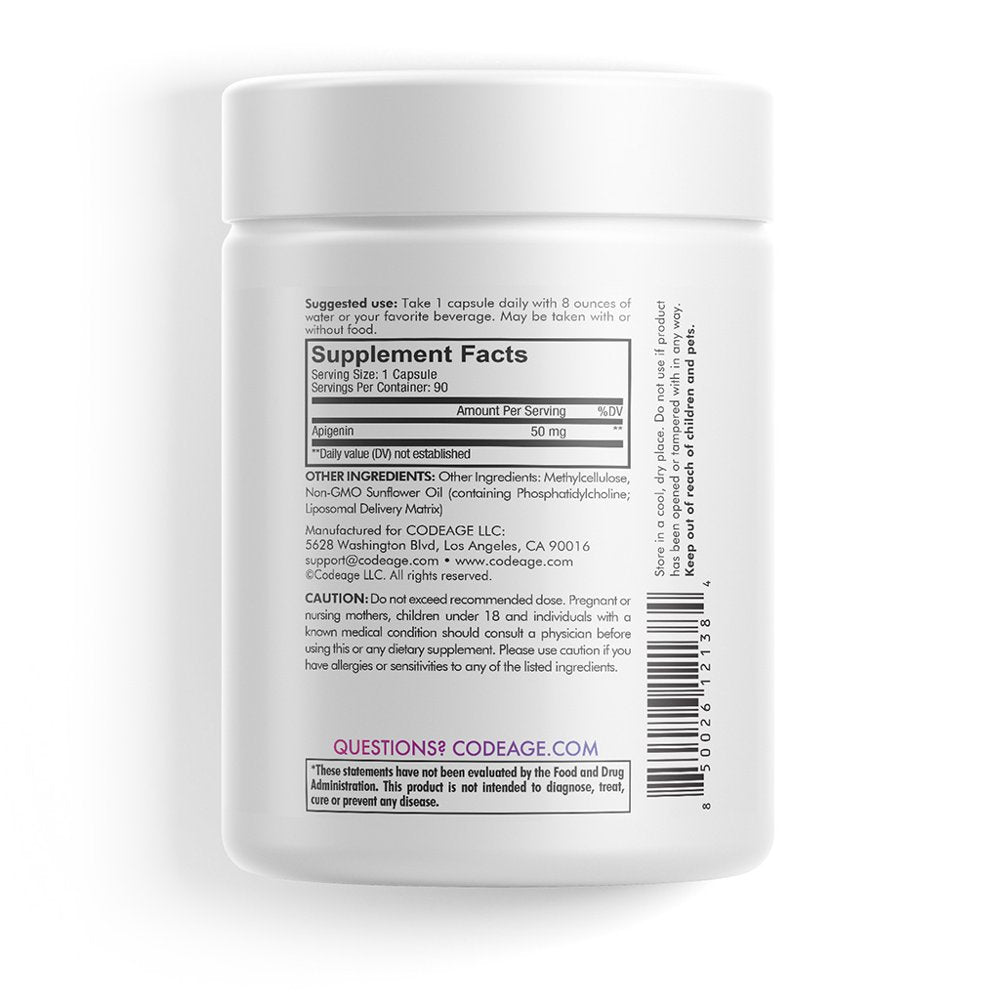 - Manufactured in the USA: Codeage Liposomal Apigenin herbal blend is vegan and manufactured in the USA in a cGMP certified facility. This liposomal chamomile tea relaxation formula with flavonoid apigenin doesn't contain any fillers, artificial colors or ingredients. Third-party tested.