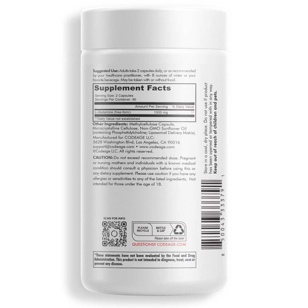 - Codeage liposomal L-glutamine capsule supplement provides high-quality, free-form L-glutamine, an amino acid to help support gut function, immune system health, and muscles.*