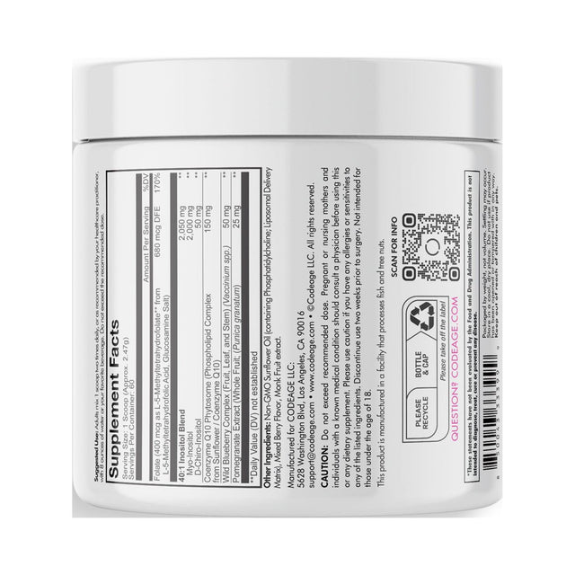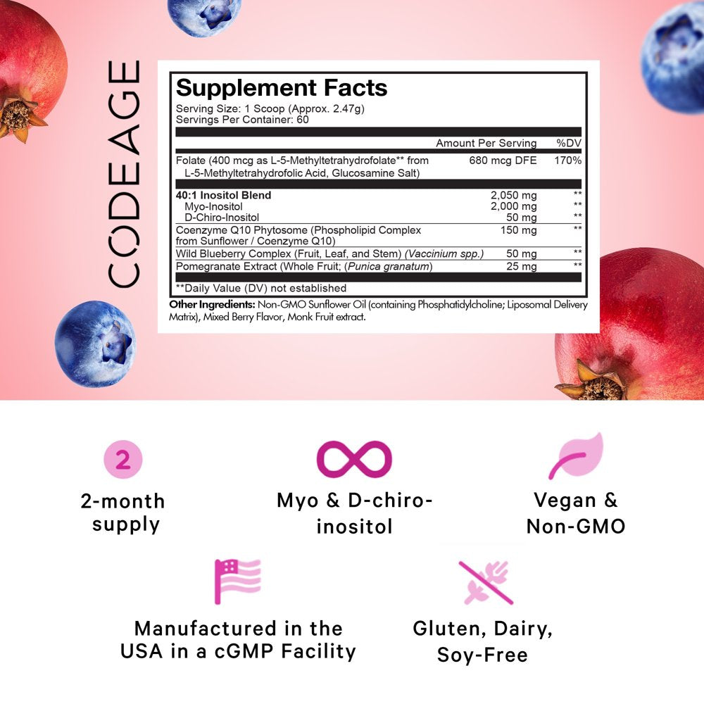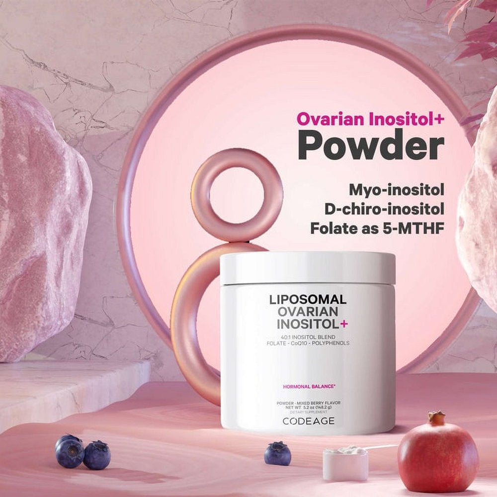 Codeage Liposomal Ovarian Inositol+ powder is a nutritional supplement designed for women, created to help support ovarian well-being and hormone equilibrium by incorporating Myo-inositol, D-chiro-inositol, 5-MTHF folate, CoQ10 phytosome, wild blueberry, and pomegranate extracts.* Features liposomal delivery for absorption and bioavailability.* Mixed berry flavor. 2-month supply.